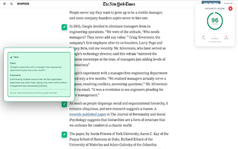 이 확장 프로그램은 세 가지 주요 기능에 중점을 둡니다: 중요한 주장을 위해 웹 페이지를 스캔하고, 이러한 주장을 신뢰할 수 있는 데이터 소스와 대조하며, 잘못되거나 오해의 소지가 있는 정보를 빨간색으로 강조 표시합니다. 이 도구를 브라우징 경험에 통합함으로써, 미디어 리터러시를 향상시키고 오해의 소지가 있는 콘텐츠에 대한 노출을 줄여, 정보에 기반한 결정을 더 쉽게 내릴 수 있습니다.